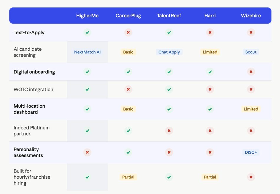But for US gym owners who hire hourly workers at scale, the debate starts with HigherMe. Only Text-to-Apply alters the number of applications you receive from candidates who would never fill out a traditional form. Add NextMatch AI, automated scheduling, no-show reminders and digital onboarding and you have a comprehensive hiring system that runs in the background while your managers are on the floor.