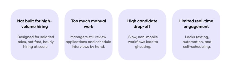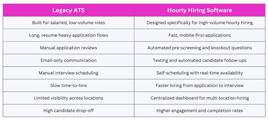 Traditional ATS were a leap forward for corporate hiring, but they simply do not match the pace, scale, and candidate experience needed for hourly restaurant hiring. Hourly hiring software is different. It is built for high turnover, high volume, and today’s mobile workforce.
